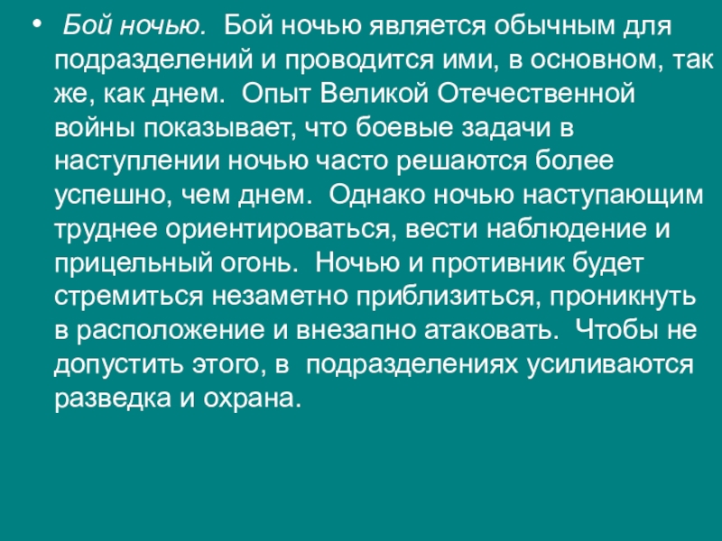 Слайд 28 Бой ночью. Бой ночью является обычным для подразделений и проводится