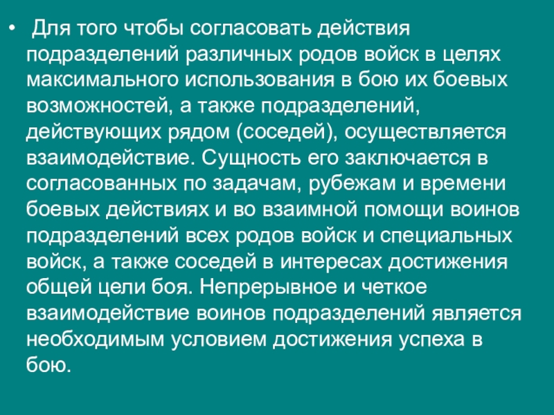 целях максимального использования в бою их боевых возможностей, а также подразделений, действующих рядом (соседей), осуществляется взаимодействие. Сущность его заключается в согласованных по задачам, рубежам и времени боевых действиях и во взаимной помощи воинов подразделений всех родов войск и специальных войск, а также соседей в интересах достижения общей цели боя. Непрерывное и четкое взаимодействие воинов подразделений является необходимым условием достижения успеха в бою.