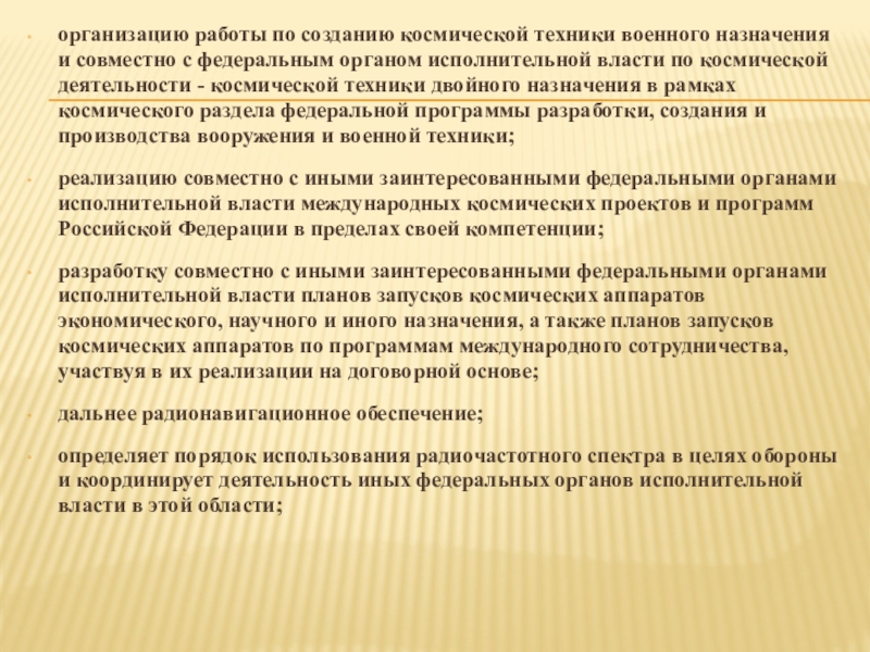 Слайд 5организацию работы по созданию космической техники военного назначения и совместно с
