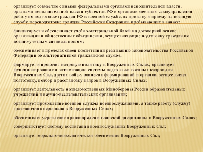 формирует и проводит кадровую политику в Вооруженных Силах, организует функционирование и оптимизацию системы подготовки военных кадров для Вооруженных Сил, других войск, воинских формирований и органов, осуществляет подготовку, подбор и расстановку кадров в Вооруженных Силах;