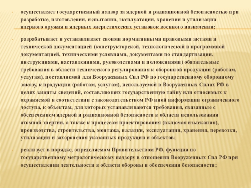 Слайд 12осуществляет государственный надзор за ядерной и радиационной безопасностью при разработке, изготовлении,