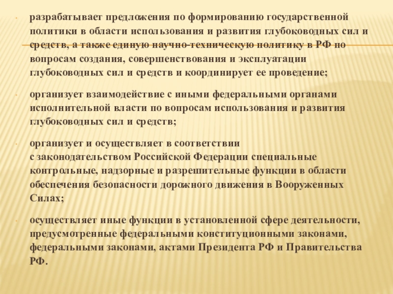 глубоководных сил и средств, а также единую научно-техническую политику в РФ по вопросам создания, совершенствования и эксплуатации глубоководных сил и средств и координирует ее проведение;