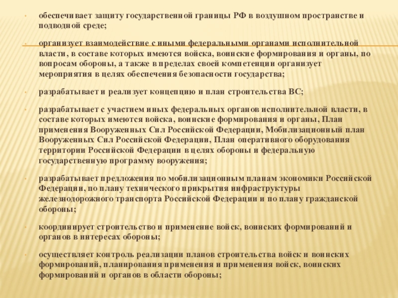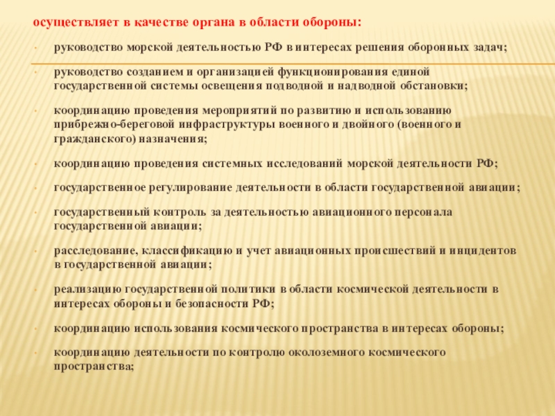 Слайд 4осуществляет в качестве органа в области обороны: