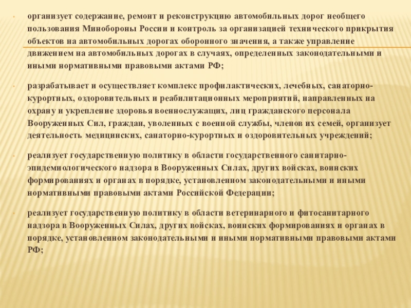 Слайд 14организует содержание, ремонт и реконструкцию автомобильных дорог необщего пользования Минобороны России