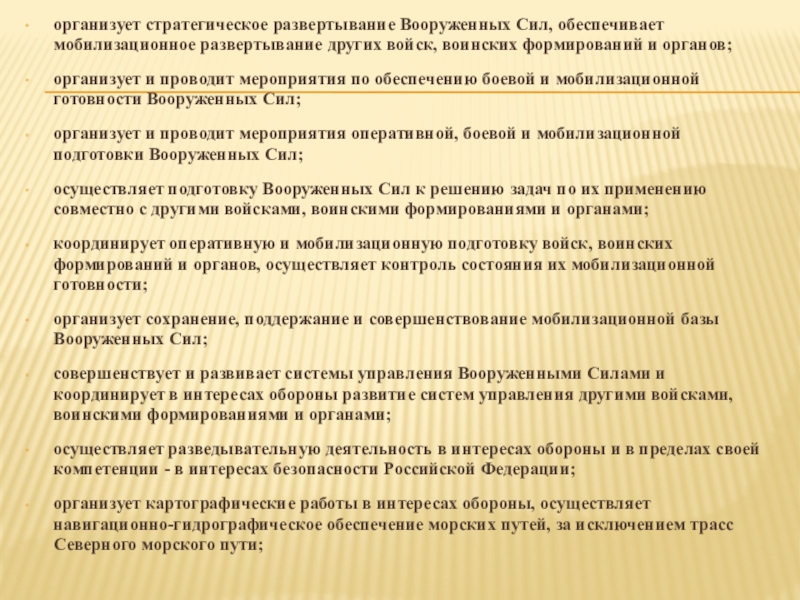 Слайд 7организует стратегическое развертывание Вооруженных Сил, обеспечивает мобилизационное развертывание других войск, воинских