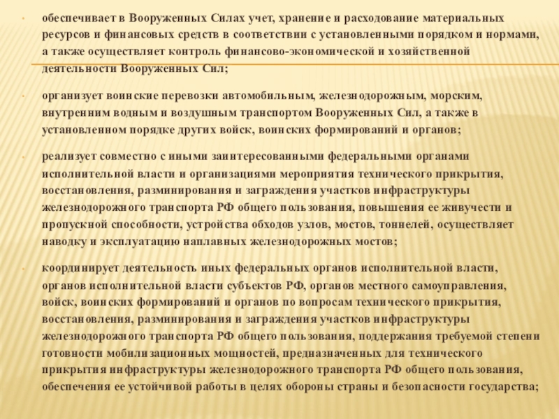 реализует совместно с иными заинтересованными федеральными органами исполнительной власти и организациями мероприятия технического прикрытия, восстановления, разминирования и заграждения участков инфраструктуры железнодорожного транспорта РФ общего пользования, повышения ее живучести и пропускной способности, устройства обходов узлов, мостов, тоннелей, осуществляет наводку и эксплуатацию наплавных железнодорожных мостов;