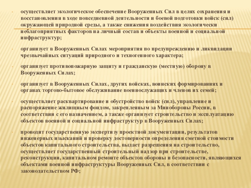 Слайд 15осуществляет экологическое обеспечение Вооруженных Сил в целях сохранения и восстановления в