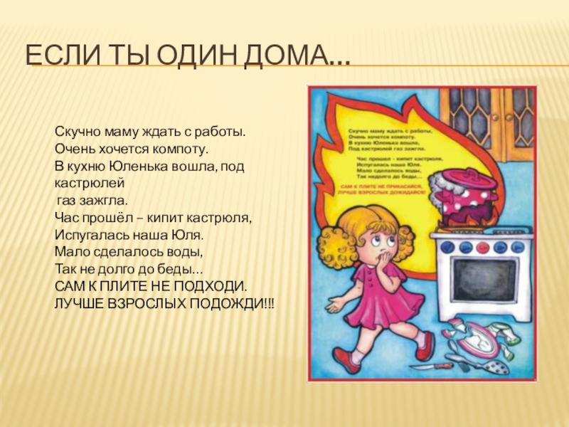 Если ты один дома…Скучно маму ждать с работы.Очень хочется компоту.В кухню Юленька вошла, под кастрюлей газ зажгла.Час прошёл – кипит кастрюля,Испугалась наша Юля.Мало сделалось воды, Так не долго до беды…САМ К ПЛИТЕ НЕ ПОДХОДИ.ЛУЧШЕ ВЗРОСЛЫХ ПОДОЖДИ!!!