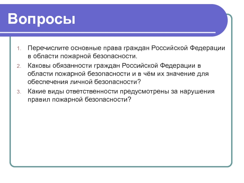 Слайд 1ПРАВА, ОБЯЗАННОСТИ И ОТВЕТСТВЕННОСТЬ ГРАЖДАН В ОБЛАСТИ ПОЖАРНОЙ БЕЗОПАСНОСТИ.