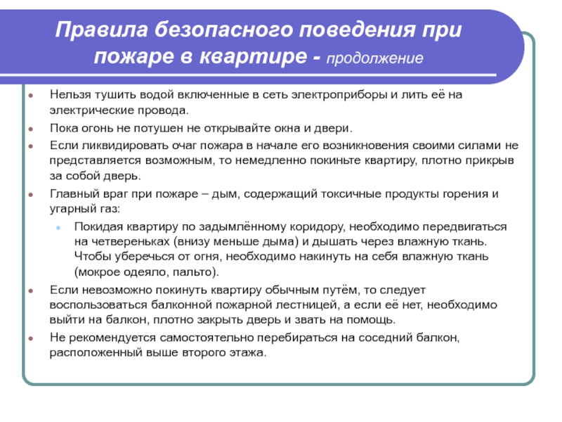 Слайд 11Правила безопасного поведения при пожаре в квартире - продолжение