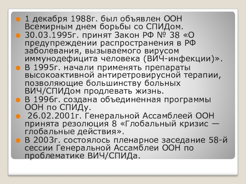 30.03.1995г. принят Закон РФ № 38 «О предупреждении распространения в РФ заболевания, вызываемого вирусом иммунодефицита человека (ВИЧ-инфекции)».