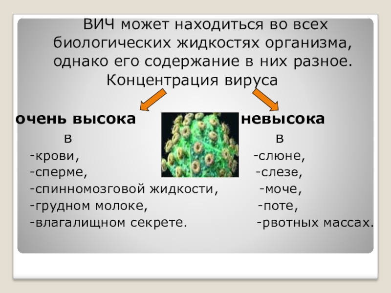 Слайд 13 ВИЧ может находиться во всех биологических жидкостях организма, однако