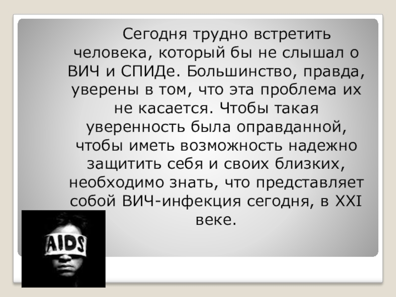 о ВИЧ и СПИДе. Большинство, правда, уверены в том, что эта проблема их не касается. Чтобы такая уверенность была оправданной, чтобы иметь возможность надежно защитить себя и своих близких, необходимо знать, что представляет собой ВИЧ-инфекция сегодня, в XXI веке.