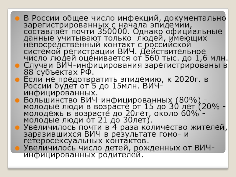 Большинство ВИЧ-инфицированных (80%) - молодые люди в возрасте от 15 до 30 лет (20% - молодежь в возрасте до 20лет, около 60% - молодые люди от 21 до 30лет).