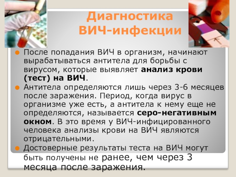 Антитела определяются лишь через 3-6 месяцев после заражения. Период, когда вирус в организме уже есть, а антитела к нему еще не определяются, называется серо-негативным окном. В это время у ВИЧ-инфицированного человека анализы крови на ВИЧ являются отрицательными.