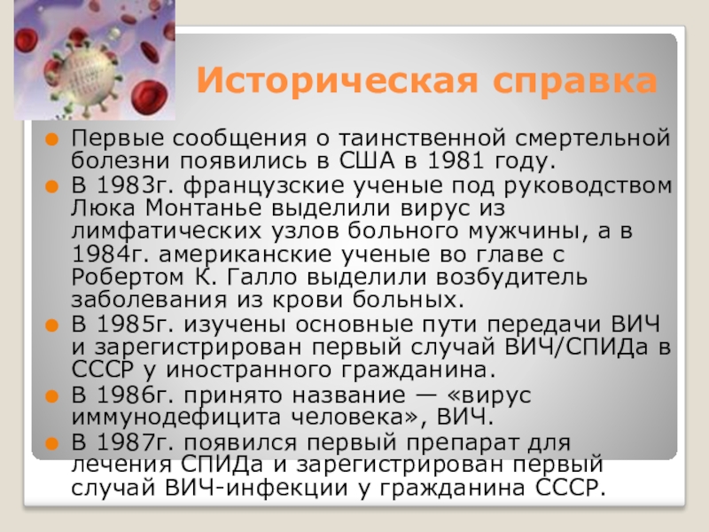 В 1987г. появился первый препарат для лечения СПИДа и зарегистрирован первый случай ВИЧ-инфекции у гражданина СССР.