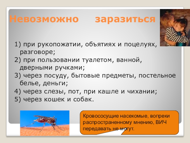 Кровососущие насекомые, вопреки распространенному мнению, ВИЧ передавать не могут.