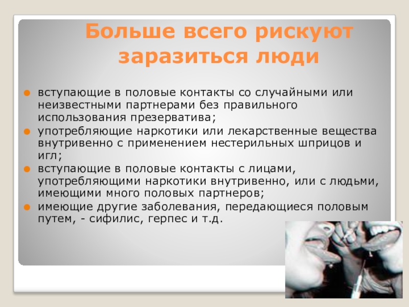 вступающие в половые контакты с лицами, употребляющими наркотики внутривенно, или с людьми, имеющими много половых партнеров;