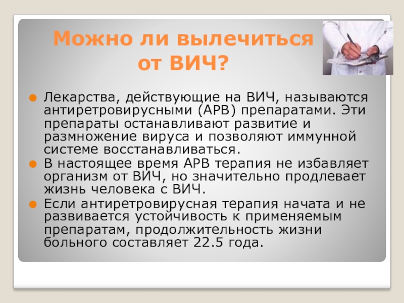 В настоящее время АРВ терапия не избавляет организм от ВИЧ, но значительно продлевает жизнь человека с ВИЧ.
