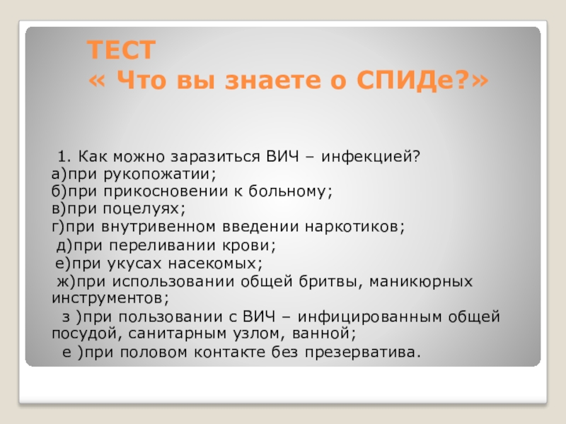 ВИЧ – инфекцией? а)при рукопожатии; б)при прикосновении к больному; в)при поцелуях;