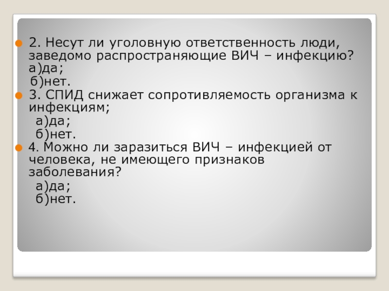 Слайд 352. Несут ли уголовную ответственность люди, заведомо распространяющие ВИЧ – инфекцию?