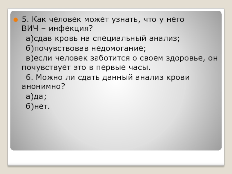 4. Можно ли заразиться ВИЧ – инфекцией от человека, не имеющего признаков заболевания?