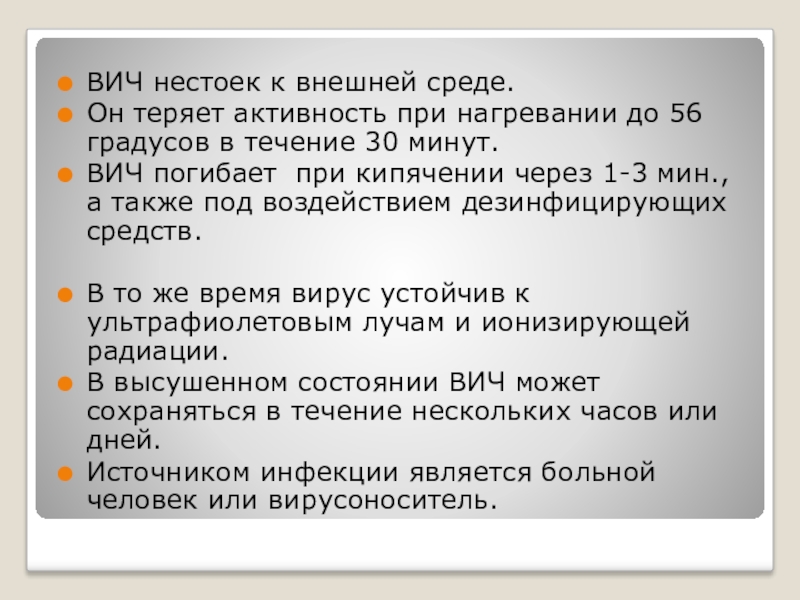 ВИЧ погибает при кипячении через 1-3 мин., а также под воздействием дезинфицирующих средств.