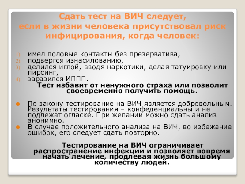 По закону тестирование на ВИЧ является добровольным. Результаты тестирования – конфеденциальны и не подлежат огласке. При желании можно сдать анализ анонимно.