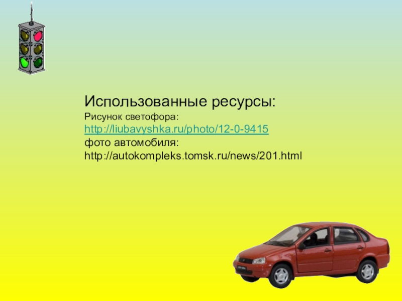 Слайд 2Использованные ресурсы: Рисунок светофора: http://liubavyshka.ru/photo/12-0-9415 фото автомобиля: http://autokompleks.tomsk.ru/news/201.html