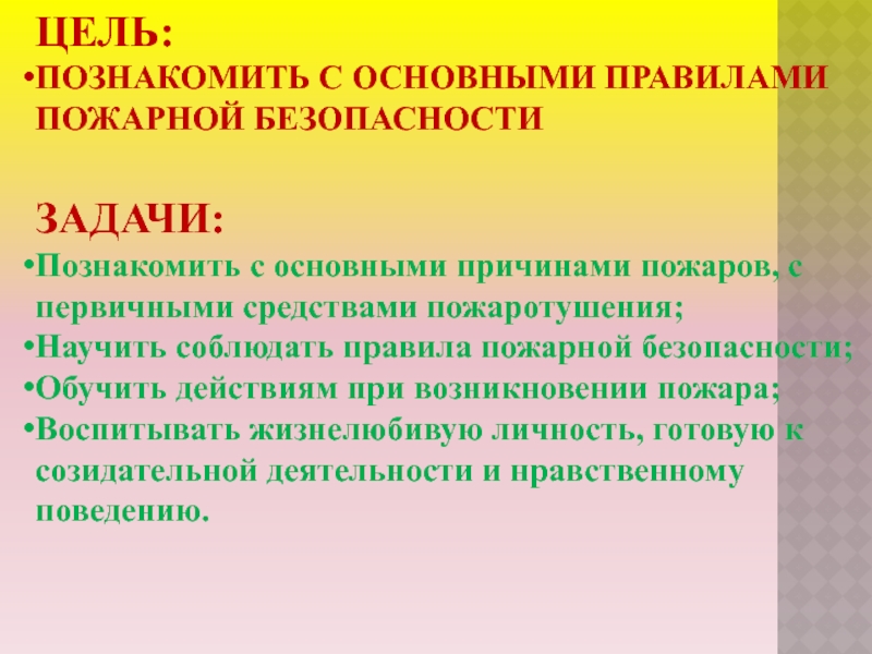 ЦЕЛЬ: ПОЗНАКОМИТЬ С ОСНОВНЫМИ ПРАВИЛАМИ ПОЖАРНОЙ БЕЗОПАСНОСТИЗАДАЧИ:Познакомить с основными причинами пожаров, с первичными средствами пожаротушения;Научить соблюдать правила