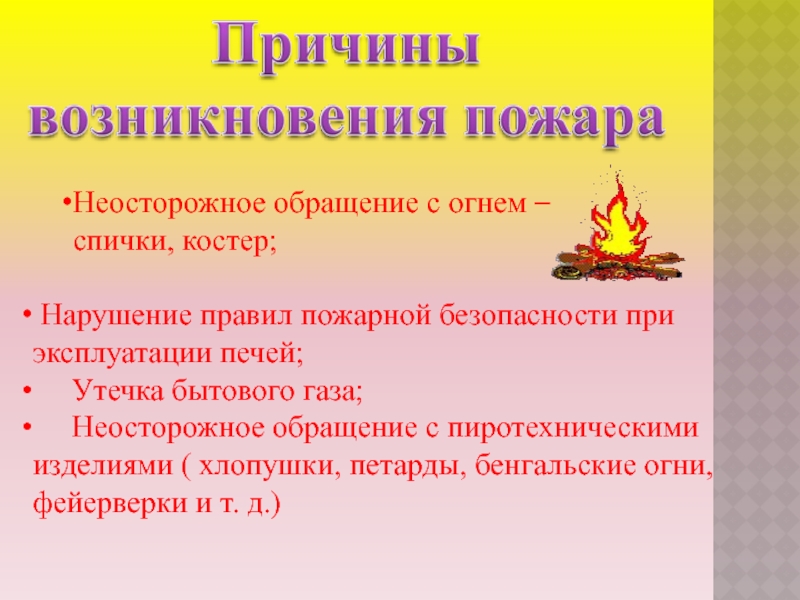 Неосторожное обращение с огнем – спички, костер;  Нарушение правил пожарной безопасности при эксплуатации печей;