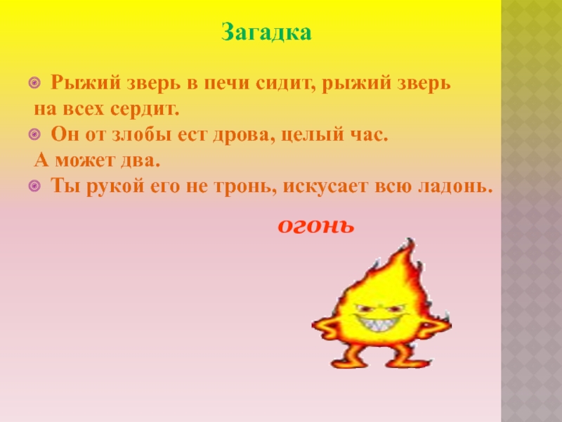 ЗагадкаРыжий зверь в печи сидит, рыжий зверь на всех сердит.Он от злобы ест дрова, целый час. А может два.Ты рукой его не тронь, искусает всю ладонь.
