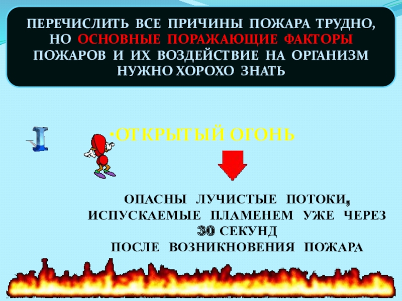 ОПАСНЫ ЛУЧИСТЫЕ ПОТОКИ, ИСПУСКАЕМЫЕ ПЛАМЕНЕМ УЖЕ ЧЕРЕЗ 30 СЕКУНД ПОСЛЕ ВОЗНИКНОВЕНИЯ ПОЖАРА