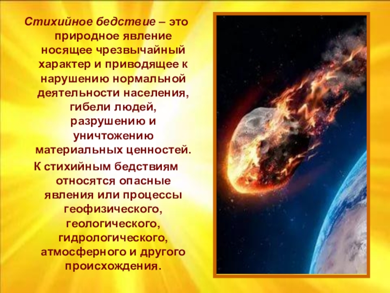 Слайд 4Стихийное бедствие – это природное явление носящее чрезвычайный характер и приводящее