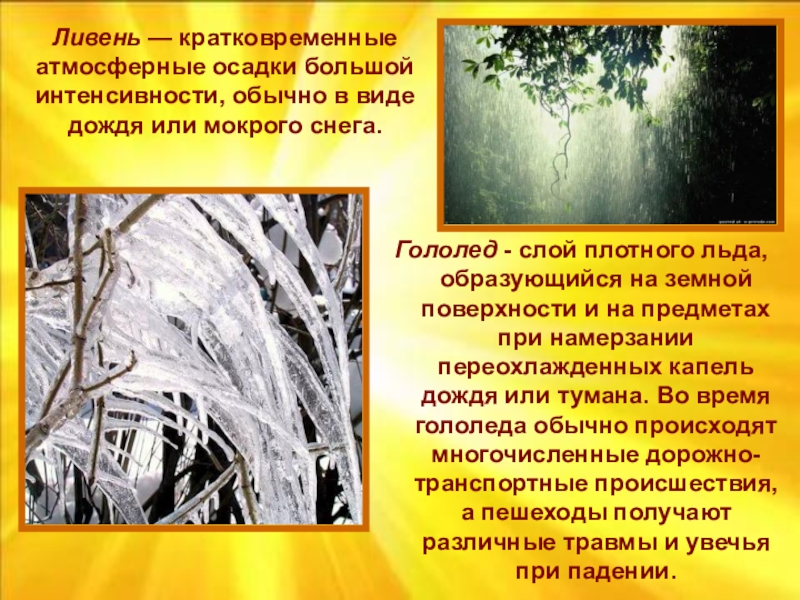 Слайд 19Гололед - слой плотного льда, образующийся на земной поверхности и на предметах