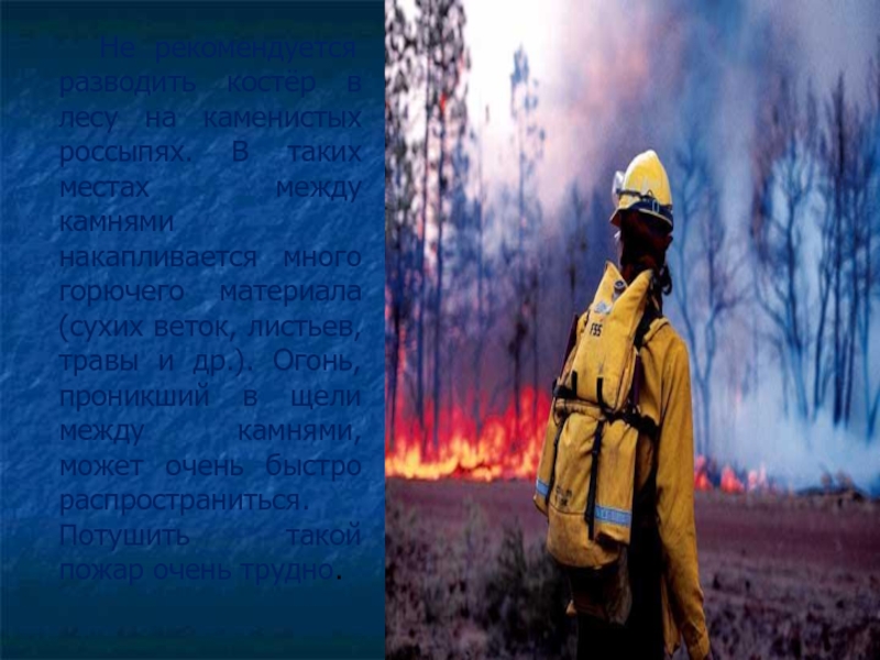 Слайд 7 Не рекомендуется разводить костёр в лесу на каменистых россыпях.
