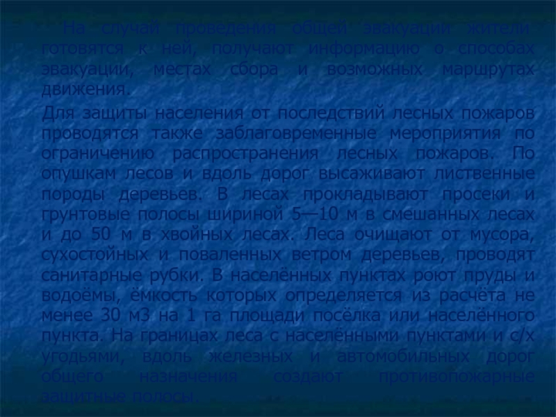 Для защиты населения от последствий лесных пожаров проводятся также заблаговременные мероприятия по ограничению распространения лесных пожаров. По опушкам лесов и вдоль дорог высаживают лиственные породы деревьев. В лесах прокладывают просеки и грунтовые полосы шириной 5—10 м в смешанных лесах и до 50 м в хвойных лесах. Леса очищают от мусора, сухостойных и поваленных ветром деревьев, проводят санитарные рубки. В населённых пунктах роют пруды и водоёмы, ёмкость которых определяется из расчёта не менее 30 м3 на 1 га площади посёлка или населённого пункта. На границах леса с населёнными пунктами и с/х угодьями, вдоль железных и автомобильных дорог общего назначения создают противопожарные защитные полосы.