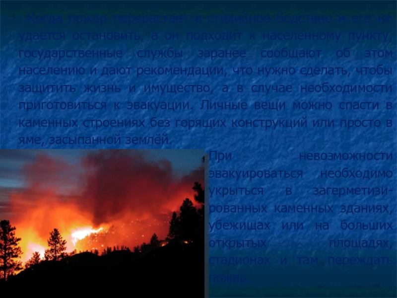При невозможности эвакуироваться необходимо укрыться в загерметизи-рованных каменных зданиях, убежищах или на больших открытых площадях, стадионах и там переждать пожар.