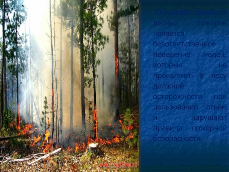 Слайд 3 Основной причиной лесных пожаров является безответственное поведение людей, которые