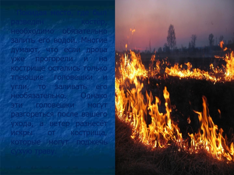 Слайд 9 Покидая место, где был разведён костёр, необходимо обязательно залить