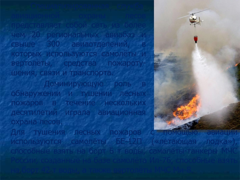 Доминирующую роль в обнаружении и тушении лесных пожаров в течение нескольких десятилетий играла авиационная охрана лесов.