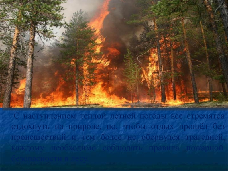 природе, но, чтобы отдых прошёл без происшествий и тем более не обернулся трагедией, каждому необходимо соблюдать правила пожарной безопасности в лесу.