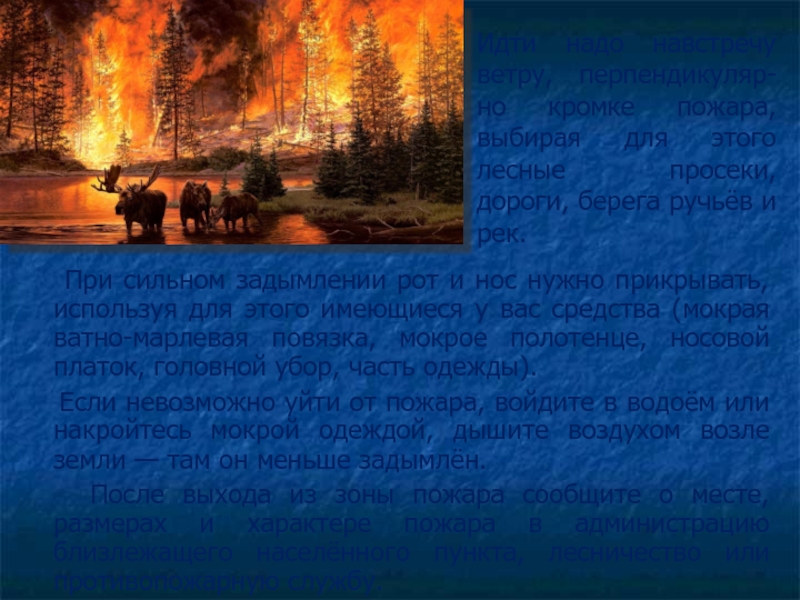 Идти надо навстречу ветру, перпендикуляр-но кромке пожара, выбирая для этого лесные просеки, дороги, берега ручьёв и рек.