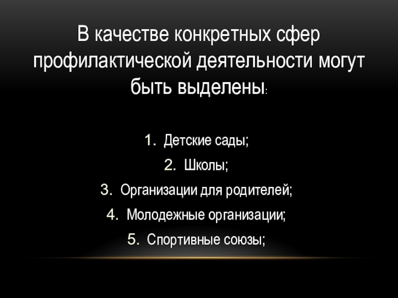 Слайд 4В качестве конкретных сфер профилактической деятельности могут быть выделены:
