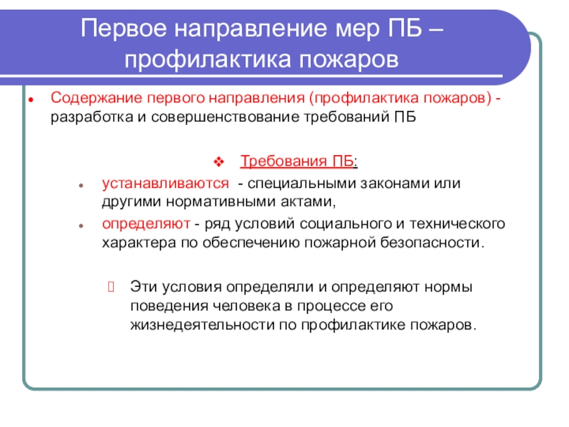 Слайд 7Первое направление мер ПБ – профилактика пожаров