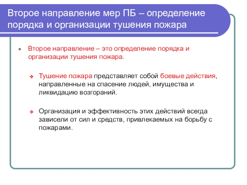 Слайд 8Второе направление мер ПБ – определение порядка и организации тушения пожара