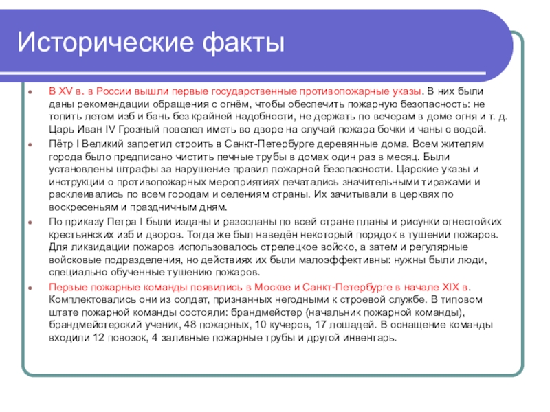 В них были даны рекомендации обращения с огнём, чтобы обеспечить пожарную безопасность: не топить летом изб и бань без крайней надобности, не держать по вечерам в доме огня и т. д. Царь Иван IV Грозный повелел иметь во дворе на случай пожара бочки и чаны с водой.