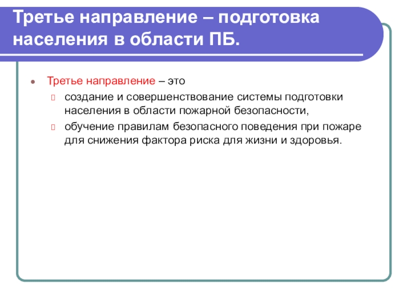 Все три направления постоянно совершенствуются государством, а их реализация способствует повышению уровня общей культуры населения в области пожарной безопасности.