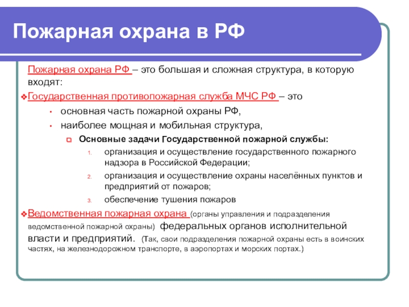 Ведомственная пожарная охрана (органы управления и подразделения ведомственной пожарной охраны) федеральных органов исполнительной власти и предприятий. (Так, свои подразделения пожарной охраны есть в воинских частях, на железнодорожном транспорте, в аэропортах и морских портах.)