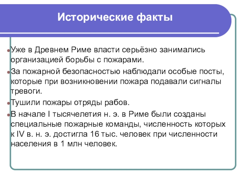 В начале I тысячелетия н. э. в Риме были созданы специальные пожарные команды, численность которых к IV в. н. э. достигла 16 тыс. человек при численности населения в 1 млн человек.